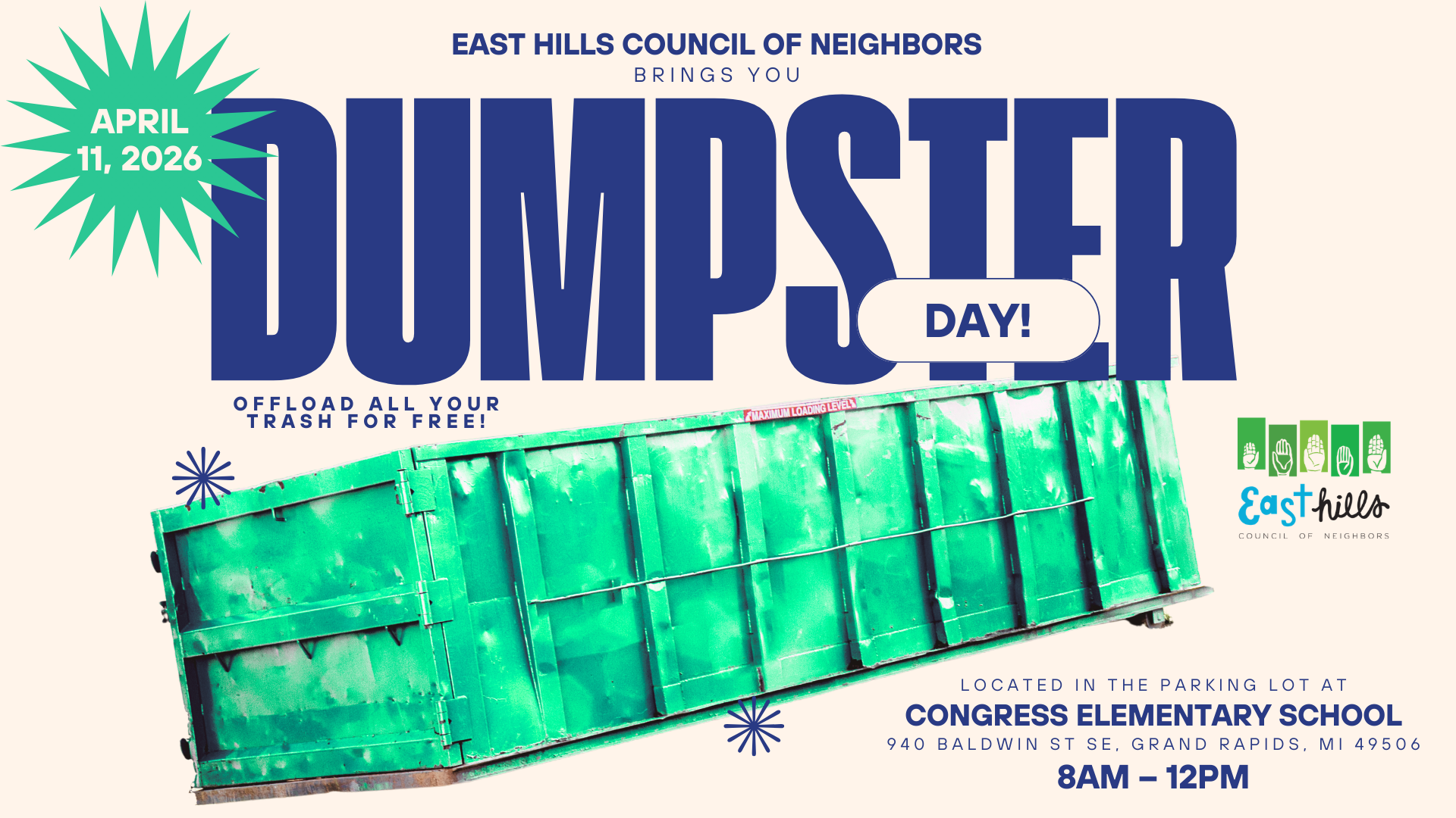 The East Hills Council of Neighbors is hosting a FREE Dumpster Day for neighborhood residents to offload household trash and do a little spring cleaning together.